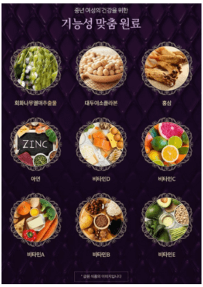 여성은 출산 후 부터 점차 기억력 감퇴 증상이 나오는데 이 제품은 피로 개선과 기억력 개선에 도움을 주는 홍삼과, 폐경 후 떨어지는 면역력을 높일 수 있는 성분과 항산화에 도움을 주는 3종의 원료로 구성되어 있습니다.