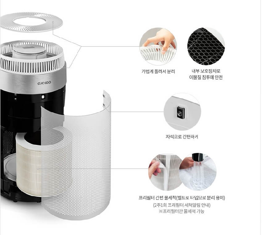 쿠쿠 인스퓨어 공기청정기의 필터는 4단계로 구성되어 있습니다. 필터는 프리필터, 기능성필터, 초미세먼지 집진필터, 탈취필터 4단계로 나눠 정화됩니다. 프리필터는 물세탁이 용이하며 벨크로 타입으로 분리가 용이합니다. 프리필터의 경우 LED 화면에서 클리닝 알림을 볼 수 있습니다.