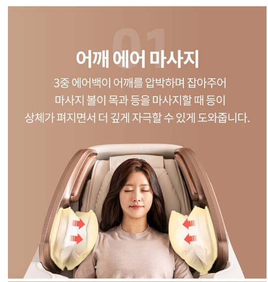 특히 에어 마사지 기능은 마사지 효과를 더 극대하 시켜줍니다. 어깨, 손/팔, 골반, 발/종아리 구역을 나누어 사람 손 처럼 시원하게 마사지를 받으실 수 있습니다.