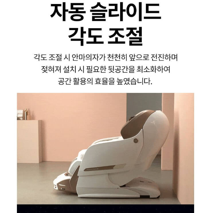 또한 제로 스페이스 슬라이딩 시스템으로 후방에 5cm 공간만 있으면 설치가 가능하며, 전신 에어 지압 마사지도 제공하여 마사지 볼로는 놓치기 쉬운 부위까지 꼼꼼하게 마사지를 받으실 수 있습니다.